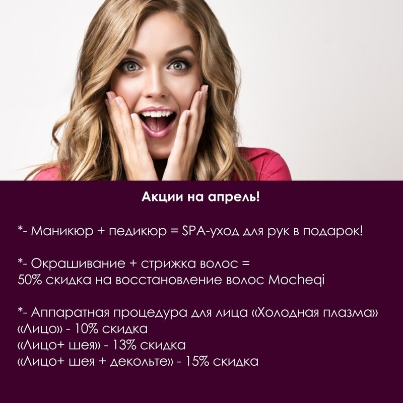 Cosmetology services:make-up, noninjection mezotherapy, anti-age procedures, lifting, hardware cosmetology, facial, eyelashes/eyebrow coloring, ultrasound, peeling, body care, eyebrow correction, cleansing, epilation, collagen, facial massage