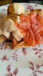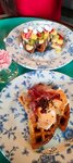 Вкусные вафли с лососем и десерт Тотальная клубника ^^ Обслуживание хорошее, ребята официанты внимательные, вежливые. Единственное - рассадка довольно плотная, столики очень близко друг к другу, не совсем приватная атмосфера)