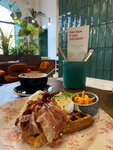 Очень красивая и супер Instagram на место чтобы пофоткаться. Очень красивая мебель все вокруг сделано очень стильно и по- дизайнерски. Классную атмосферное место которое хорошо не только своим дизайном но и подачей блюд. Но если вы очень голодные то не советую идти в это место потому что здесь идут более лёгкие блюда и их легендарные вафли. Советую попробовать вафлю с Пеканом очень классно сочетание.