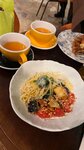 После прогулки взяли с собой кофе, десерты и тройную порцию болоньезе Кофе вкусный, ни убавить ни прибавить) Десерты: Клубничная кексовая штука, не помню как называлась, но было очень вкусно Карамельный макарони свежайший, мягчайший, карамель так и растекается, очень вкусно Маковый эклер богат на начинку, нежный, вкусный Баноффи пай также не расстроил, вкусная штука с приятным тихим банановым вкусом и нежным, слегка терпким солоновато-карамельным кремом (солёная карамель вообще частый ход, судя по всему, и это прекрасно) Паста, к сожалению, расстроила, оказалась жирноватой и сухой. Впрочем, так как мы брали домой, смогли исправить ситуацию молоком. Зато с собой щедро положили натёртый сыр, за это спасибо