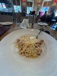 Хорошая еда, провальное обслуживание. Отзыв будет развернутый, люблю писать в деталях) В настоящее время часто обедаю одна, и в силу этого замечаю больше деталей, чем если бы пришла в компании с кем то. Заведение в целом неплохое, но на мой взгляд интерьерно слабый, хотя сама локация вокруг ресторана безумно красивая. В самом заведении такие, устаревшие элементы интерьера. Мне кажется давно пришла пора поменять кресла, диванчики, выглядят подуставшими. Я заказала пасту карбонара и так же десерты на вынос, потому что мне не захотелось здесь задерживаться из за портье (Девушка с волосами по плечи и челкой). Что было не так? Часть столиков расположена очень неудачно, при входе сразу справа, и получается так, что из за того, что другие столы были свободны, девушка просто стояла и смотрела на меня в упор, тк в ее обязанность как я понимаю входит только повесить вещи и рассадка гостей. Тоесть все трапезу я чувствовала и видела, что она смотрит. Так же возле столика портье постоянно крутился какой то работник мужчина, который разговаривал по телефону и без конца решал свои рабочие вопросы. Почему это нельзя сделать, не у зоны, где кушают гости - непонятно. Меня например напрягало слушать их болтовню и рабочие разговоры. За минут 40 что я была здесь - они не прекращались. Но напряжение вызвала в большей степени у меня все же девушка портье. В какой - то момент видимо ее настолько утомило стоять, что она начала хрустеть шеей, не переставая смотреть на посетителей 😅 Я честно говоря вообще прикола не поняла. Темненькая девочка официант очень шустрая, мягко работала с гостями, я уверена она бы справилась и могла бы на себя взять такую простую задачу как повесить вещи и посадить людей, для чего там этот сотрудник портье? Возможно , ее миссия нужна при полной рассадке. Но у меня данный сотрудник вызвал только напряжение и искреннее желание быстрее все съесть и уйти. Когда в заведении спокойно, уютно, по домашнему, я обожаю писать в личный дневник, сидеть, свои мысли думать. Здесь мне не было уютно. Было повышенное внимание, которого мне не хотелось. Ощущение , что кто то все время стоит у тебя за спиной (ощущение , если вы правильно поймёте о чем говорю). Это не приятно. Мои границы, как гостя, были нарушены. Карбонара не была изумительной, НО честно была сделана на твердую четверку. Из плюсов - было от души добавлено много сыра, это действительно редкость, вкусное мясо, но к сожалению было заметно, что во первых паста не домашняя, а во вторых не из самого качественного помола пшеницы, тоесть если подвести, могу сказать так, паста была изумительная, соус, мясо, сыр, но само макаронное изделие, было как тонкая отварная макфа, уверена если заведение будет использовать более примиальное макаронное изделие, их паста вполне потянет на бестселлер. Девушка, которая стояла на стойке в эклерами, была самой милой и клиентоориентированной.
