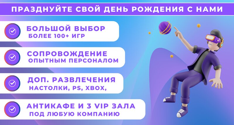 Отмечали день рожденье ,сына 11 лет .Забронировала 8 шлемов ,виртуальной реальности на 2 ,5 часа и антикафе с сониплэйстейшен на 3 часа .Праздник проходил в четверг с 15 до 18 часов. И обошелся в 20500 рублей! напитки и торт ,я купила и принесла заранее ,заказала пиццу .Особенно отметила для себя ,чистоту ,работу персонала. Для каждого ребенка ,был сотрудник -помощник ,проводник в мир в.р. ,для каждого была подобрана игра индивидуально .В конце они играли вместе. Часть детей отделилась играли в приставку .Ели пиццу. в общем открыла для себя это место .Есть две вип комнаты ,можно и весь клуб снять ,если у вас большая компания.