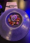 Брускетты из поджаренной на гриле чиабатты с мелконарезанным филе тунца и свежим авокадо, заправленные соусом на основе сладкого Чили, подаётся с нежным муссом из авокадо и украшается микрозеленью.