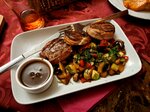 Свиная шея в томатном маринаде. Подается с маринованным луком и томатным соусом