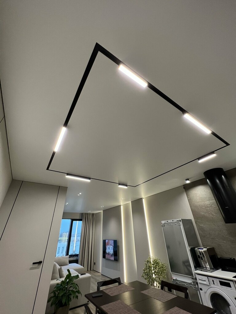 Система образует теневой кант по периметру помещения. Эффект затемнения зрительно увеличивает площадь и высоту. Минимальный зазор между потолком и стеной не нуждается в маскировки плинтусом или вставкой. Это современный способ отделки помещения.