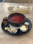 Хороший горячий борщ с мясом, свежий салат оливье, сразу чувствуется, что не три дня в холодильнике стоял. Бургер сфотографировать не успел, он выглядел очень аппетитно, съел его так. Принесли всё в нужном порядке, ждал не долго. Вид из окна — на площадь Юности. Душевное место, люди приходят отдыхать с детьми.