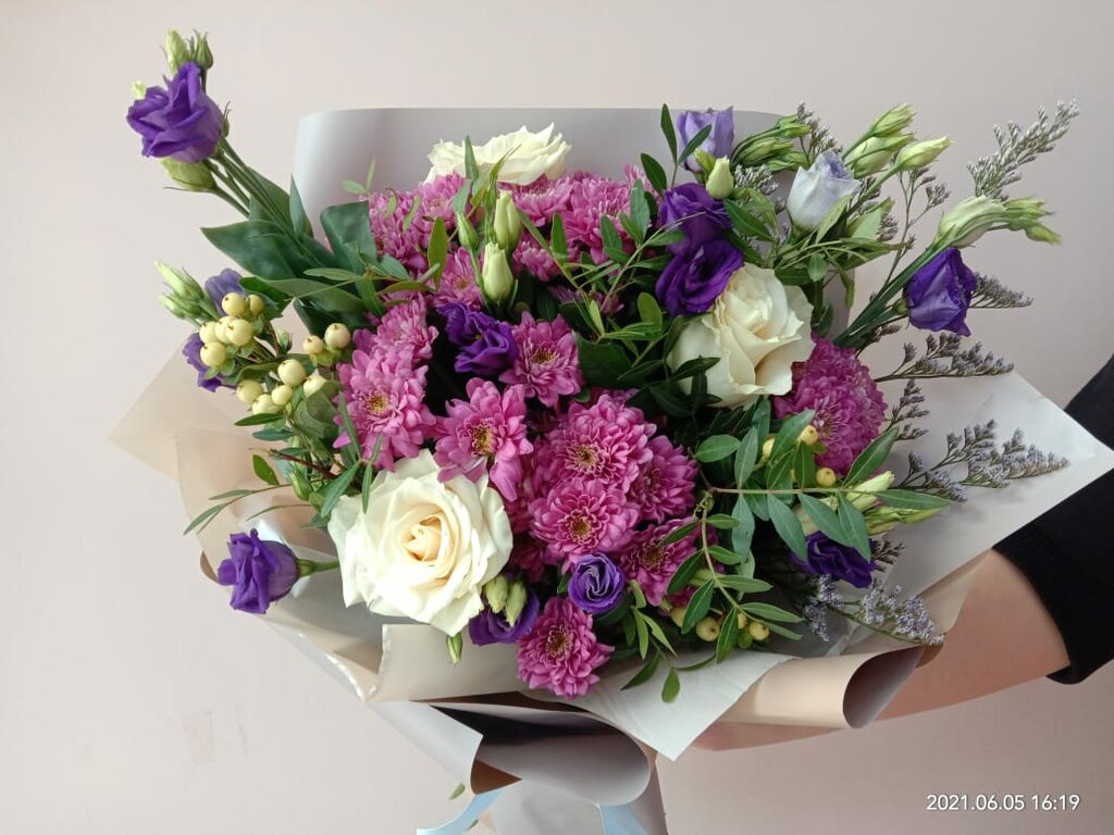Состав: Хризантема кустовая - 5шт. Маттиола - 6шт. Статица - 2шт Упаковка