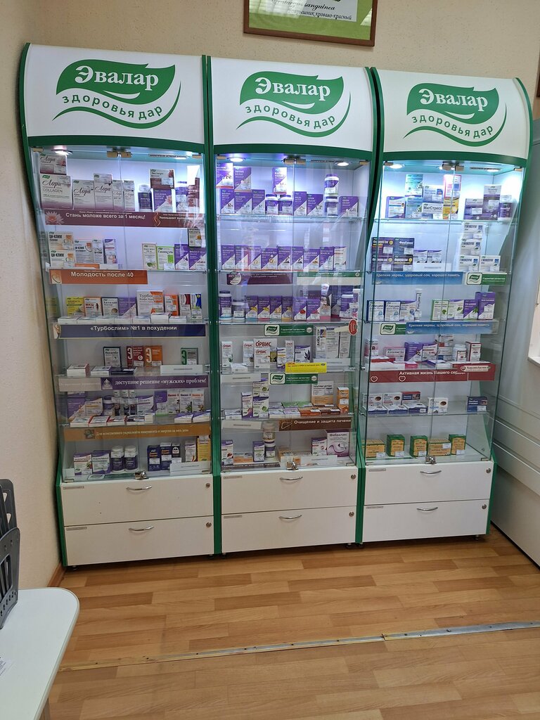 Основная продукция фирмы Эвалар, это понятно по названию . Большой ассортимент есть что выбрать несмотря на то что помещение маленькое . Не весь товар на витрине если что спрашивайте у фармацевта а они тут хорошие специалисты !