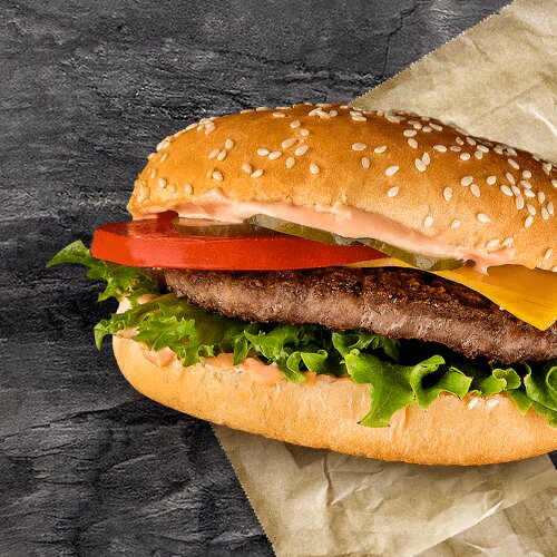 ,Граммовка: 220 Состав: котлета из говядины, сыр Чеддер, помидор, салат Айсберг, маринованный огурчик, сырный соус и кетчуп
