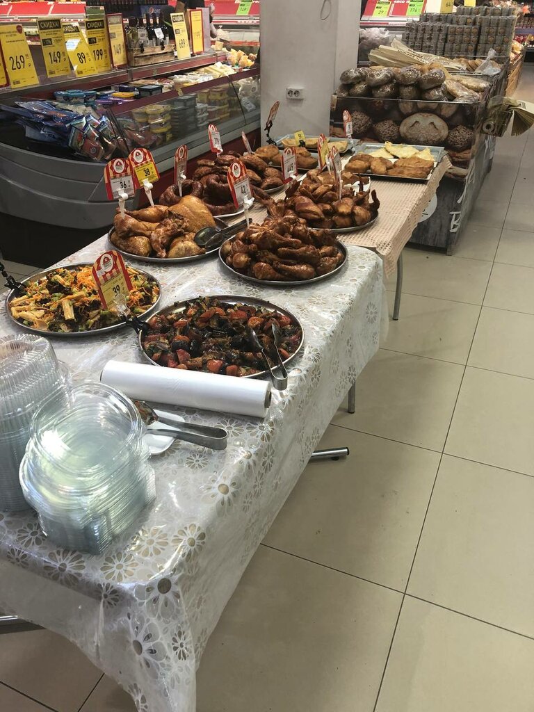 Первый раз был в этом магазине. Большой выбор товаров, правда акционный товар оказался дороже чем в других магазинах, нужно проверять. Понравился рыбный отдел, есть свежая и вкусная выпечка. Касс самообслуживания не очень много, но в некоторых магазинах их вообще ещё нет.