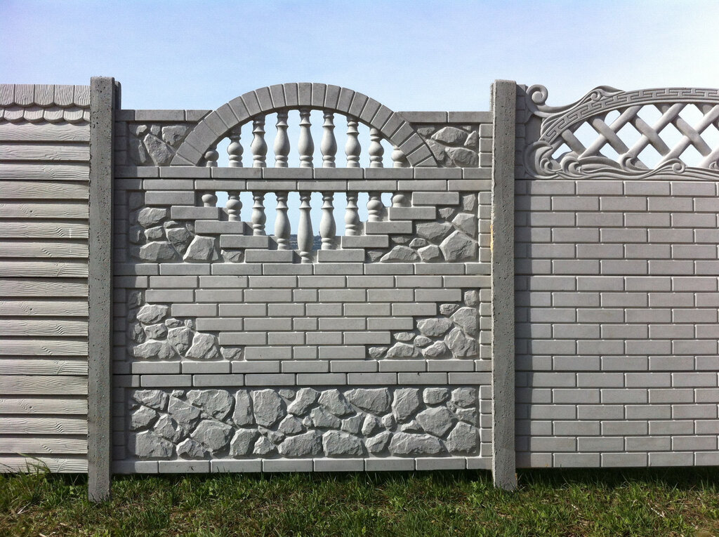 Общие характеристики: Размеры панели: длина – 2 м, высота - 0,5 м; Вес плиты от 70-100 кг. Длина 1 пролета (плита + столбик) - 2,06 м; Высота забора: 1,0 м, 1,5 м, 2 м и 2,5 м.