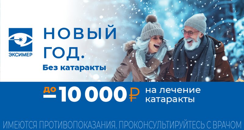 Скидка до 10 000 рублей на лечение катаракты. Акция действует до 31 января 2026 г. Размер скидки зависит от вида интраокулярной линзы.