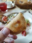 Подается с тремя видами макало: соль с перцем, соевый подкопченный соус, бруснично-горчичный соус