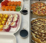 Variety of food:sushi and rolls, pizza, burgers