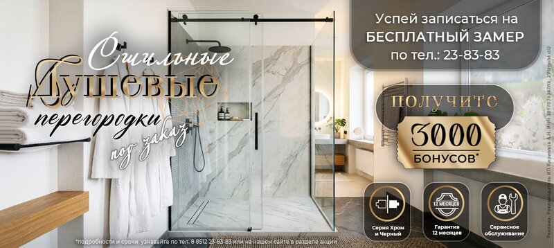 Запишитесь на замер душевой перегородки и получите 3000 бонусов. Потратьте бонусы на текущий заказ при оформлении договора свыше 10 000 руб...