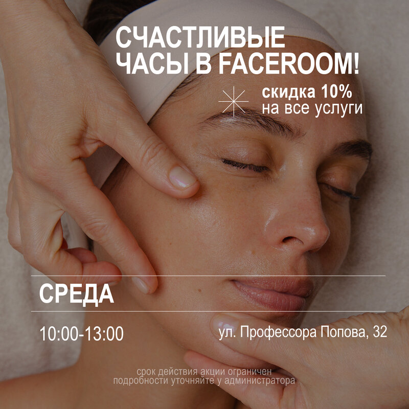 СЧАСТЛИВЫЕ ЧАСЫ В FACEROOM! Скидка на все услуги 10% ул. Профессора Попова, 32 среда 10:00 - 13:00 Срок действия акции ограничен, подроб...