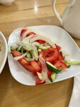 Салат невозможно есть ,кислый майонез перебивает весь вкус Жаркое с курицей ,в меню филе курицы с перцем ,по факту непонятные куски курицы и требуха ,перец не приготовлен просто потомили Из позитивного то что этого добра навалили очень много аж все падала с тарелки Чай и хлеб были вкусные
