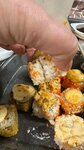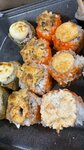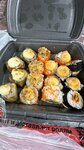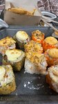 Привезли с опозданием и полную жуть. Картошка фри холодная и варёная, роллы все перевернуты, разваливаются сами собой, ингредиенты е не равномерно распределяются. Полная жуть, да ещё и в праздник Важное уточнение: все роллы были выбраны без креветок, но аллергия у меня все таки началась, видимо и на кухне не все чисто 🤬