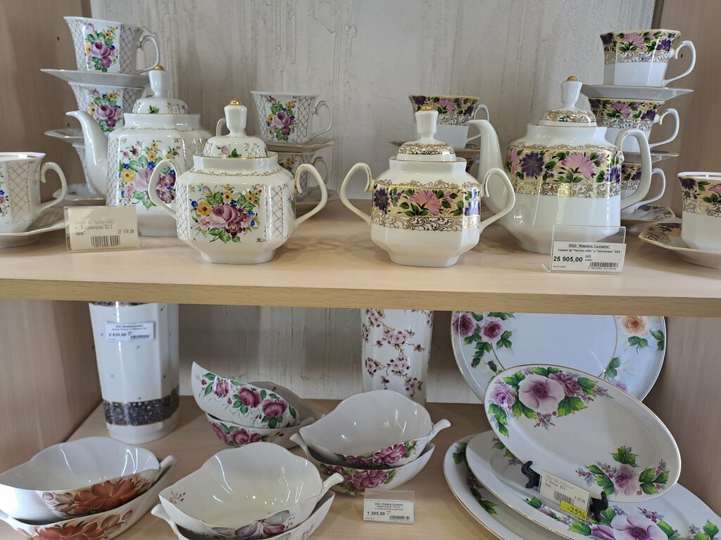 Это один из единственных магазинов сысерсткого фарфора. Цены там намного дешевле чем на маркетах, ярмарках. Много разного вида посуды, сервиса, фигурки.