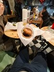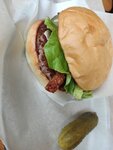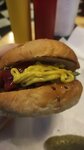 Очень вкусный бургер! Свежий фарш,магкая булочка.Как фишку к бургеру дают солёный огурец! В зале плотно стоят столы, похоже что много народу бывает.