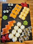 Variety of food:sushi and rolls, pizza