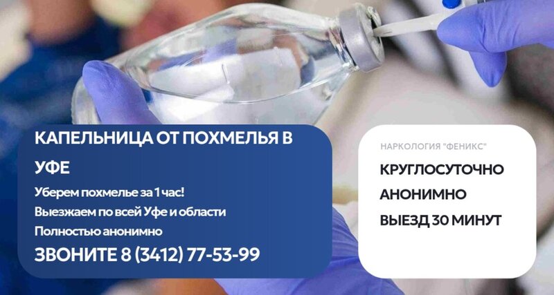 Прокапаться от алкоголя с выездом на дом в Уфе. Вызовите доктора прямо сейчас! Доступные цены от 3 000 руб. Работаем 24/7 в стационаре и с выездом на дом! Уберем похмелье за 1 час!