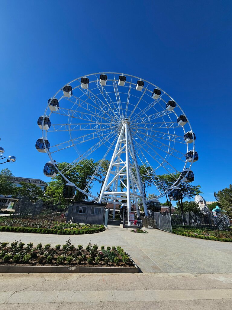 Отличное 👍 колесо. Кабинки модернизированы, кресла с двух сторон, кондиционер, затемнённое стекло. Ход у колеса бесшумный, мягкий. На верху колеса открывается прекрасный вид на парк, море, акваленд (аквапарк).