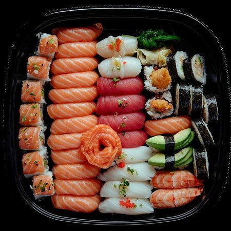 Variety of food:sushi and rolls, pizza, сhinese food