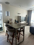 Кухня с фасадами из матовой эмали, Столешница из искусственного камня Grandex, Мойка из нержавеющей стали под подклейку, Фурнитура Blum, Скрытые ручки-профиль Gola, Обеденный стол со столешницей из искусственного камня и металлическим каркасом