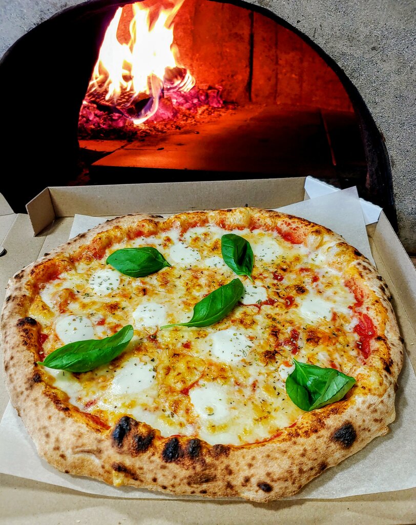 Delicious pizza from the oven. There is a heavy load during rush hours, the wait can be about an hour, we waited 30 minutes. It's worth waiting a bit to try out this pizza. The prices are reasonable. There are chairs and tables outside to sit and eat, the space in the establishment itself is small, just to place an order and watch from the outside how the guys try to cook and bake your order. The pizzeria is located off the road, opposite the gas station.