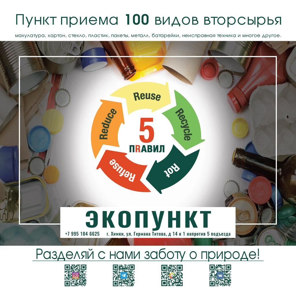 Действительно уникальный коллектив, вернее очень дружная команда волонтеров! Огромный плюс - РЕГУЛЯРНОСТЬ акций по сбору вторсырья! Сдать в переработку здесь можно практически всё! Ещё плюс: в телеграм чате "5 правил Химки" всегда отвечают на вопросы, что и как сдавать, проводят акции по экопросвещению, а также субботники и многое другое!