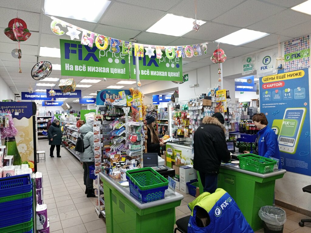 Fix Price - низкая цена. Прекрасный магазин по низким ценам большой выбор снеков и напитков а так же есть электроника есть и надежная но покупать не советую:) персонал вежливый и быстрый всё отлично