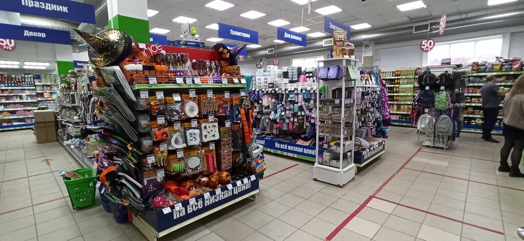 Достаточно большой магазин в спальном районе, много товаров в отделе посуда/кухонная утварь и школьные принадлежности. Ощущение, что товаров типа шампуни, крема меньше, чем в других магазинах этой сети