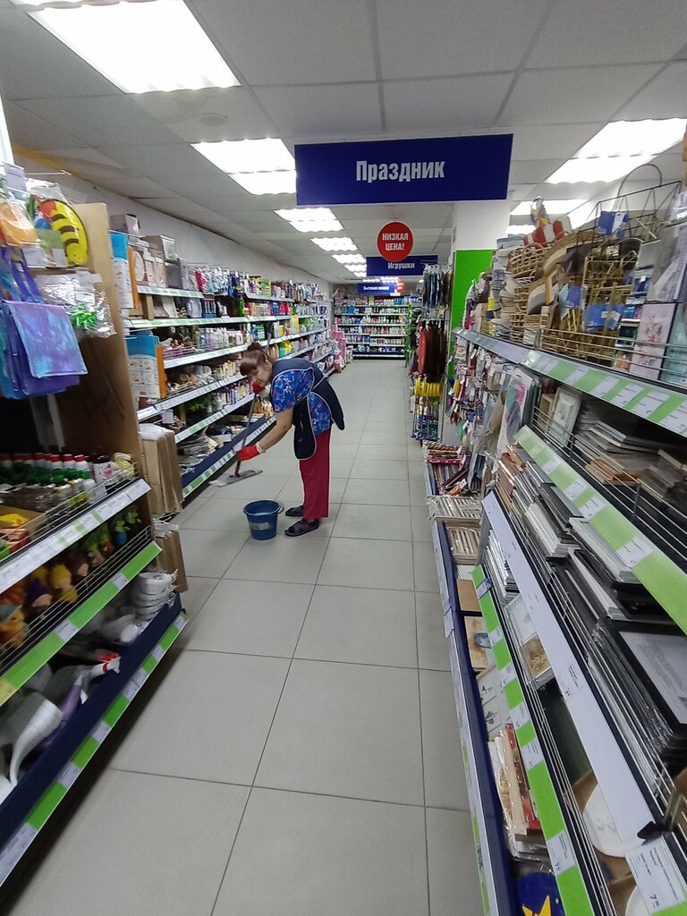 A large assortment of goods, an average store area, narrow aisles between the shelves, there is no turning around during rush hour. Sometimes you have to tinker to find the price tag for the product. There are 3 ticket offices, but 1 works more often, less often 2, but nevertheless the service is fast. Minus a star for narrow passages.