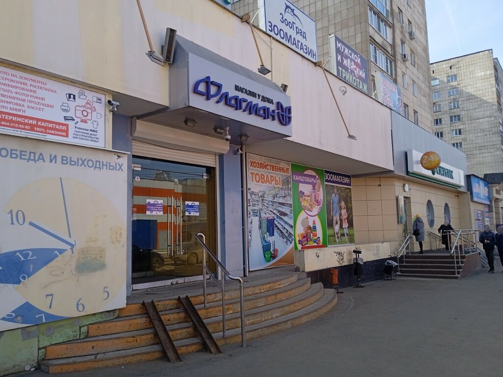 Торговый центр "Флагман" имеет несколько отделов:хозяйственный, канц.товары, здоровое питание,аптеку и недавно появился отдел товары для животных.Есть недостаток -очень узкие проходы в хозяйственном отделе. Но очень нравится фото отдел,где можно сфотографироваться на документ.Размножить или распечатать это делается быстро и качественно.