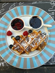 Сидели на веранде, погода была шикарная! Очень уютно. Меню не большое, но каждый сможет выбрать что-то свое! Очень понравилась индейка гриль с дыней и треска с кабачками! Льежские вафли подавали с ягодами, шоколадом и ягодным вареньем- ребёнок доволен!