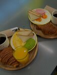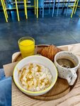 Брала комплексный завтрак. В кофейне раньше бывала местами - знаю, что у Сварщицы всегда вкусный кофе) теперь решила попробовать и еду. Выбор блюд для завтрака небольшой, нет выбора сока. Каша 9/10, оч сытно и вкусно. Для меня суховата. Круассан 10000/10, это именно тот круассан, каким он должен быть в идеале 😭 Сок и фильтр 🫰 Гала в подарок 🥰 Разочаровал, неожиданно, даниш с голубикой, который взяла в дополнение. До этого мне его на дмитровке предложили в качестве извинения за то, что перепутали заказ, и там он был очень нежный, несладкий, именно голубичный. Шикарный, я еще месяцами его вспоминала. Сейчас же крем(?) внутри был настолько тошнотворно-приторно-сладкий, что весь фильтр и сок не смогли заглушить, аж скулы сводило. Долго еще ощущался, больше ни в жизнь не возьму. Из плюсов - мне до сих пор не хочется сладкого, а я жутко сладкоежка. Получается, сэкономлю на десертах сегодня 😁👍 Ну и как всегда, быстрое обслуживание и душевная команда, место оживленное, с приятной энергетикой.