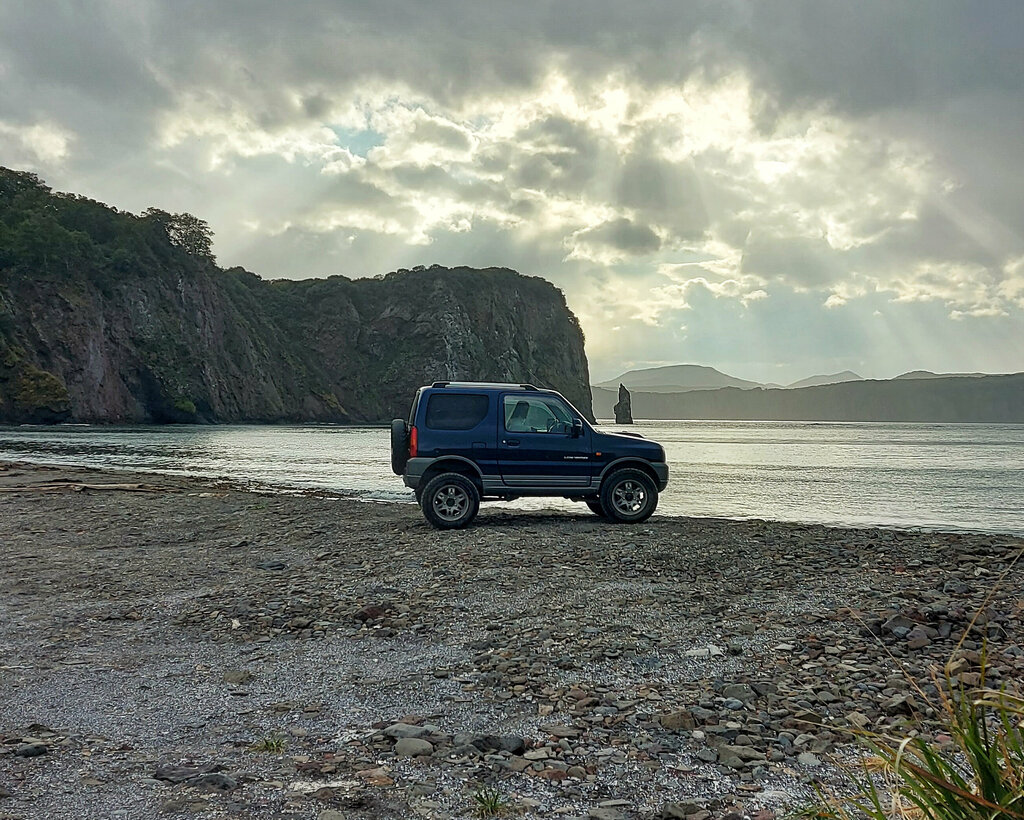 Арендовали светло-серый Джимни на 2 дня. Машина свежая из Японии, чистая, все работает. В багажнике стильный чемодан со всем необходимым – компрессор, аптечка, даже лопата. Ездили до Халактырских скал, в сторону мыса Маячного, Авачинский перевал, Озерки. После тех же маршрутов на Хонде в дождь, на Джимни в сухую погоду по бездорожью вообще супер. На трассе нормального мотора конечно ему не хватает - обороты, шумно. Ребята на связи, подскажут-помогут. Случайно встретили нас в городе, заметили отвалившийся передний номер – дали запасной.
