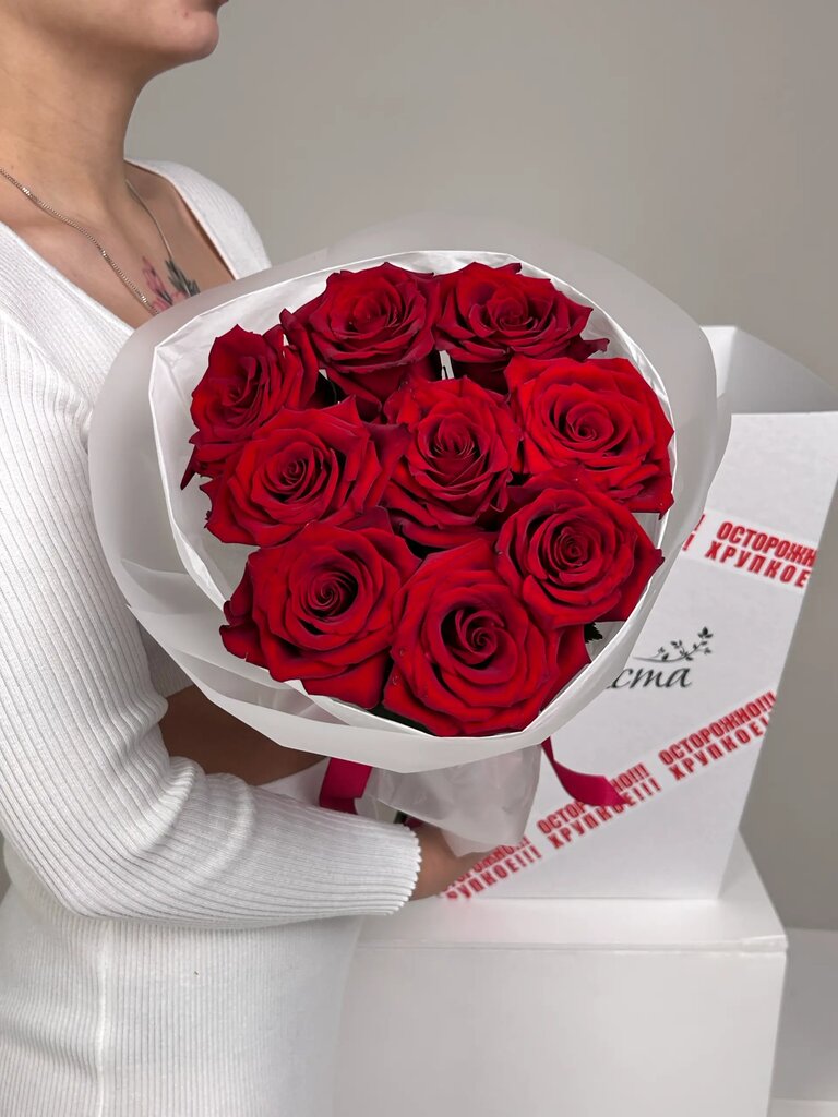 Роза кустовая Лидия - 9 шт. Упаковка для цветов S - 1 шт. Атласная лента - 1 шт. Мини-открытка с Вашим текстом - 1 шт.