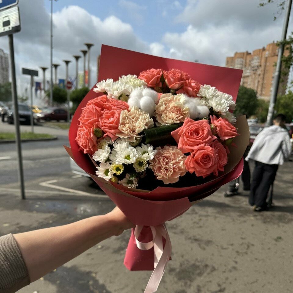 Цветы: диантус — ароматные цветы любви, хлопок — белоснежные волокна ткани, альстромерия — яркие символы дружбы, аспидистра — зеленое украшение интерьера. Наличие уточняйте заранее!