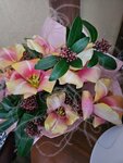 Супруг подарил букет на праздник. Сказал, что букет не собирали, а был уже готовый. Сам букет получился красивый, яркий. Есть одно НО. Стебли сразу подрезала, добавила в воду раствор для букетов (шел с другим букетом в наборе). Воду меняла каждый день. В общем, не поставила и вспомнила через 3 дня. Хорошо, что букет состоял из разных цветов и веточек (эвкалипт) и из-за этого увядание было не так заметно. Потому что розы в составе завяли через два дня, прямо пожухли и опустили бутоны, как маленькие кустовые, так и большие. Был сухоцвет из хлопка, рассмотрела поближе, а он уже отломан от стебля и прилеплен обратно. В первозданном виде букет простоял дней 5, потом один за другим цветы вяли. В общем, просите собирать букет при вас, потому что такое ощущение, что в букет включают не свежие цветы (не все, но есть).