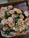 Букет с розами, гортензией, ранункулюсами, маттиолами. Возможна замена некоторых цветов на похожие.