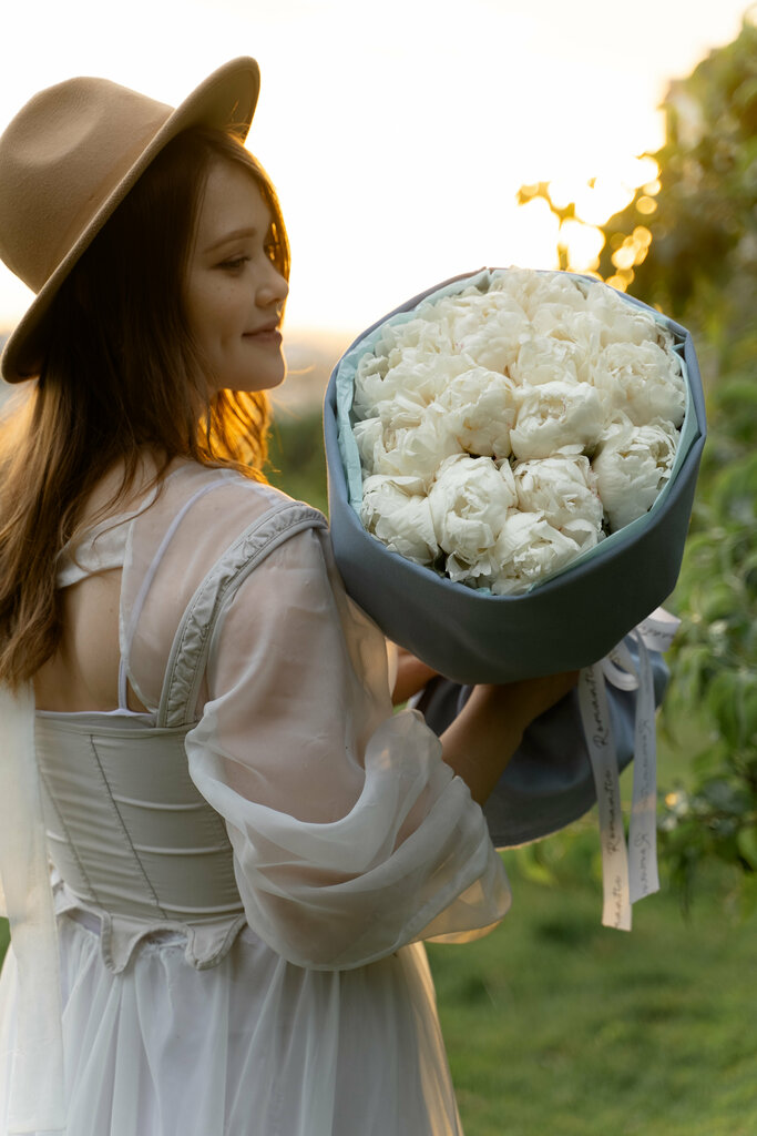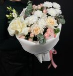 Пышный белоснежный букет в нюдовой упаковке — как чашка пломбира в тёплый день. Элегантный, универсальный и очень трогательный вариант для любого случая.