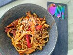 Лапша удон, курица, перец сладкий, цукини, соевый соус, соус терияки, соус сладкий чили, шампиньоны