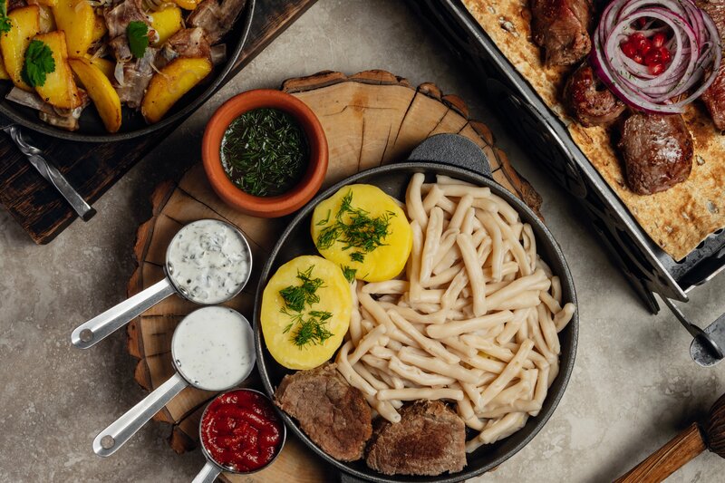 Легенда Кавказа! Сочные Ребрышки Карачаевского барашка, подаются в мини-мангале с лавашом, маринованным луком и фирменным томатным соусом.