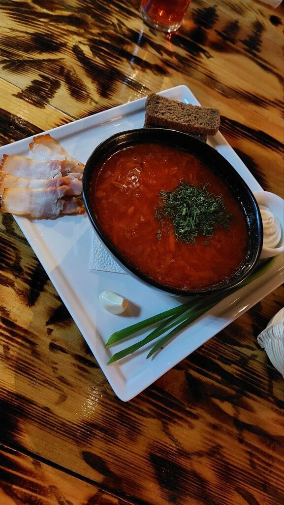 Дороговато, но в пределах разумного, запечённый картофель, с курицей и грибами в соусе советую; борщ обычный, сало к борщу супер. Дизай столов интересный, в помещении прохладно. Музыка на любителя, официант отличный.