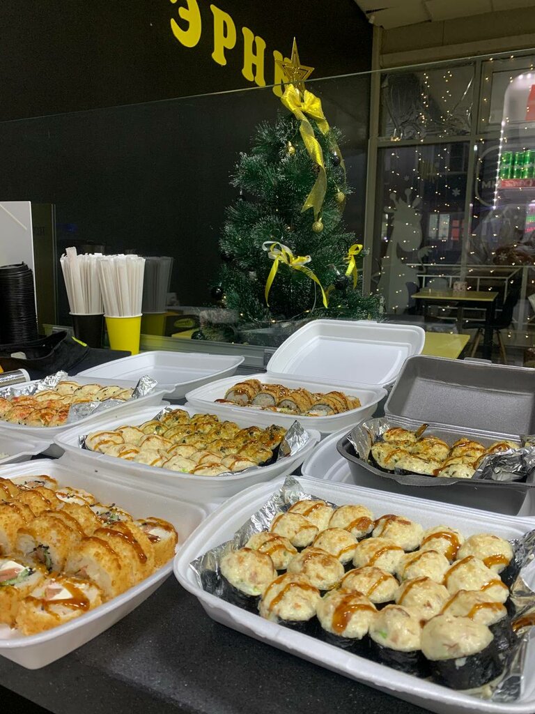 Variety of food:sushi and rolls, pizza, сhinese food, burgers