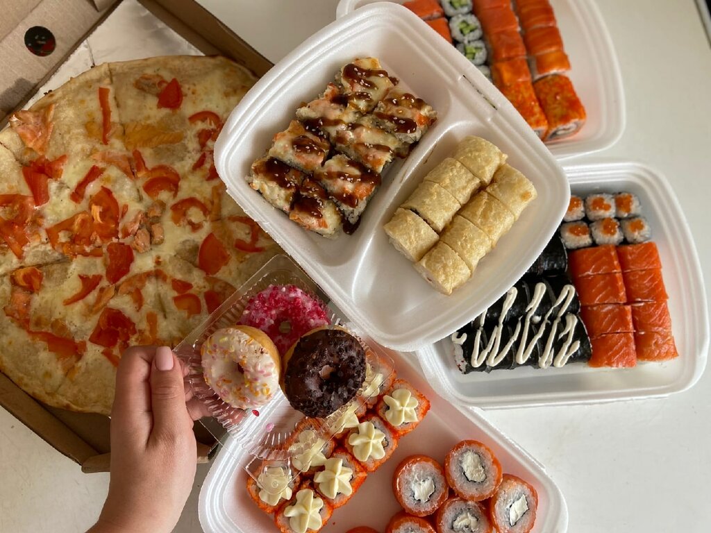 Variety of food:sushi and rolls, pizza, burgers