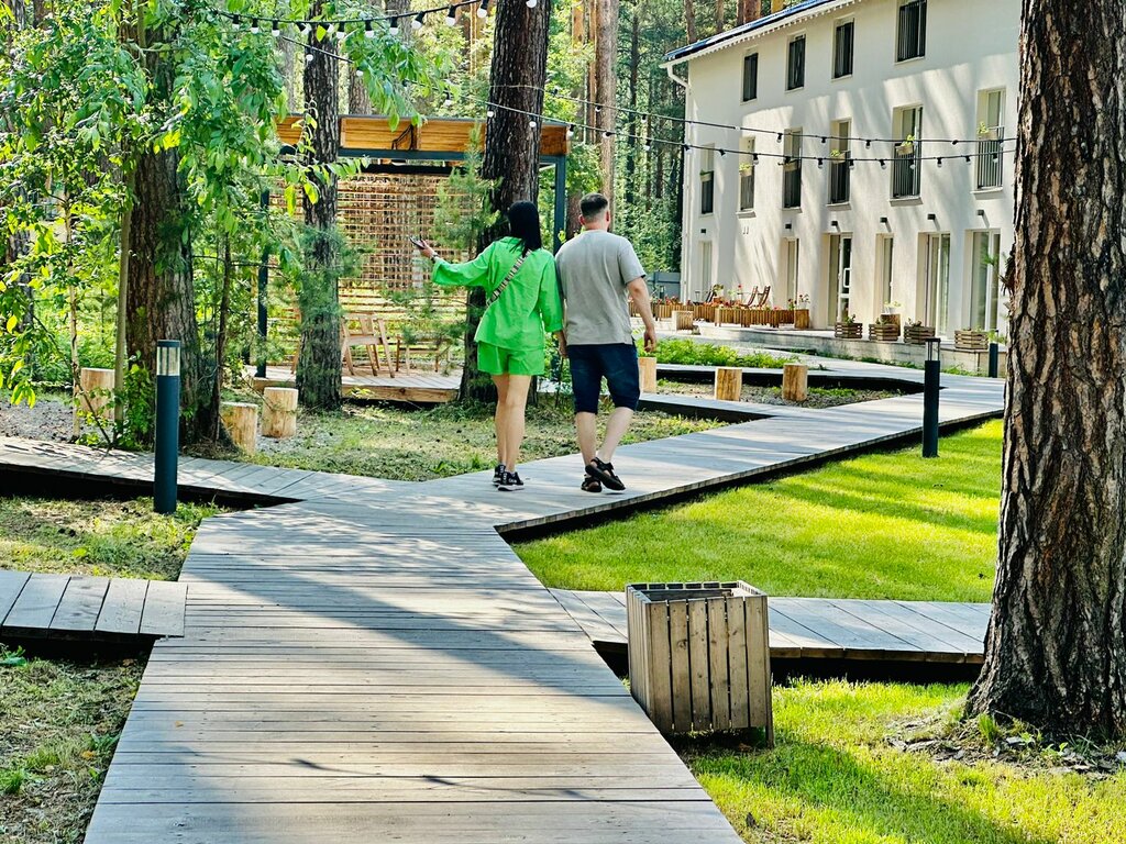 Очень красивое место, приятно гулять и наслождаться природой. Разнообразное растительное наполнение и ланшафт. Много беседок в разных стилях, где можно посидеть и подумать, наслаждаясь природой и пением птиц. Удобные помостки по всей территории для перемещения. Из развлечений есть качель, детская площадка, батут, волейбольная площадка, настолки, игры, футбол настольный и аэрохоккей. Прекрасный пруд в центре с чистой водой и красивыми растениями. Было интересно наблюдать за живностью в пруду. Вечером очень красиво светятся гирлянды. (Поставьте ещё качельки, они такие крутые!) Номера: для нас было достаточно просторно на двоих человек. В ванне душевая кабина, всё честенько. В номере есть телевизор, мини-холодильник, шкафы. Минусы: слышимость просто невероятная, вообще нет шумоподавления, всё слышно вокруг. Из соседнего душа текла вода и у нас всегда была небольшая лужа. Мусорное ведро в баке ну очень маленькое, стоило поставить побольше, раз уборка раз в 4 дня. Уборку у нас не получилось провести персоналу,потому что на номер из 2 человек почему-то есть только два ключа. Сделайте на будущее, пожалуйста, третий. Потому что давать двум людям один ключ неудобно жильцам, а с двумя ключами у нас Вы не могли убрать номер. Не хватает хотя бы одной микроволновки в здании. Можете на стойке регистрации написать, что в шкафчиках у чайной станции есть бумага и пакеты, мы просто не знали, потому что об этом никто при заселении не сказал. Дверца шкафа очень громко бьёт по стенам, когда открываешь. Пожалуйста, решите проблему с интернетом. В номерах вообще ничего не грузит, кое как работают месседжеры, только в ресторане нормальный интернет. Общие впечатления остались положительные, но стоит поправить детали в бытовом плане, чтобы в будущем не было изъянов.