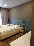 Красивый корпус, расположен прямо в лесу, свежо, утром птицы поют прямо под окном. Мне понравились панорамные окна. Мы жили на первом этаже и прямо из номера можно выйти в лес. В номере чисто, тепло и уютно. Дочкам понравился диванчик для сна. Они даже спорили, кто там будет спать. Большая мягкая двухспальная кровать. На полу ковролин. Тапочки, зубные щётки, пасты, шампунь и гель для душа, бутылка воды, сейф - вообщем, всё включено. Нам очень понравилось!